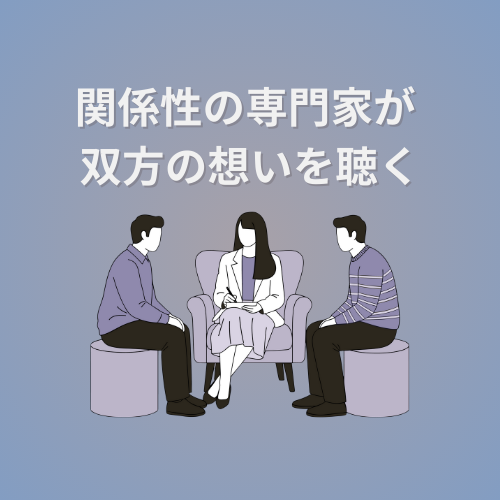 Re:lationでは、 弁護士のように「どちらかの味方」になるのではなく、 第三者として「お互いの想いを聴き、整理し、言語化する」 サポートを行います。